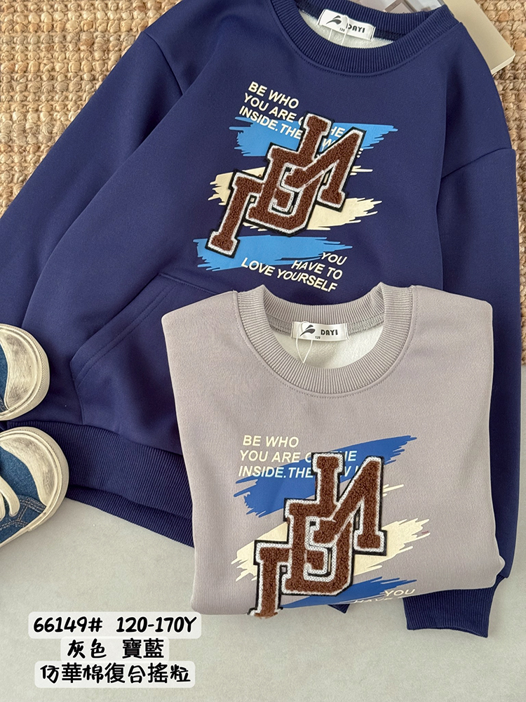刷毛*中大男童 印刷毛線字母刷毛棉T恤【寶藍色】[66149] RQ POLO 秋冬童裝 中大童 120-170碼 搖粒絨