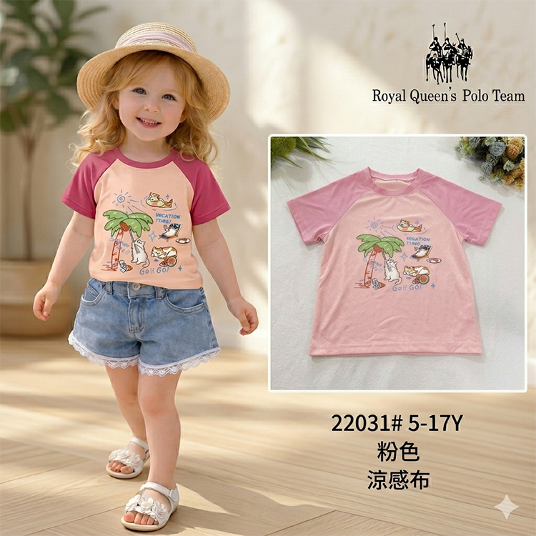小女童 涼感速乾網眼冰絲 小貓咪渡假短袖上衣圓領T恤 5-17碼 [22031] RQ POLO 小童春夏童裝 短袖上衣