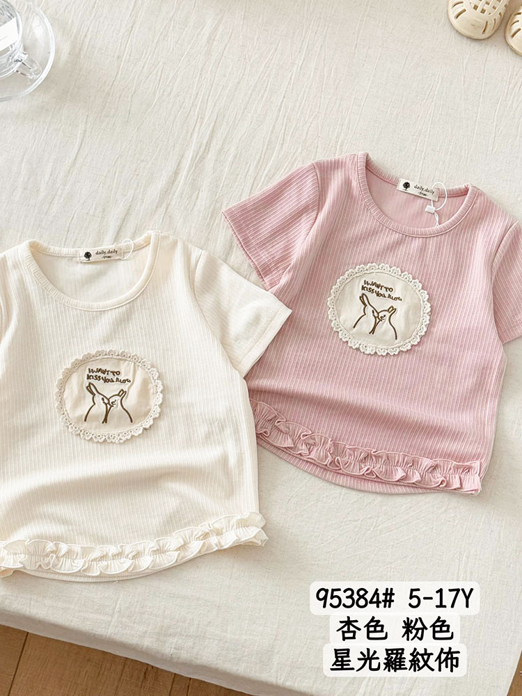 小女童 兔兔刺繡蕾絲下擺短袖圓領T恤 5-17碼 [95384] RQ POLO 小童 春夏童裝 條紋布 坑紋布 羅紋布