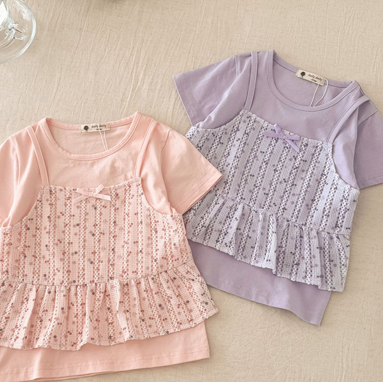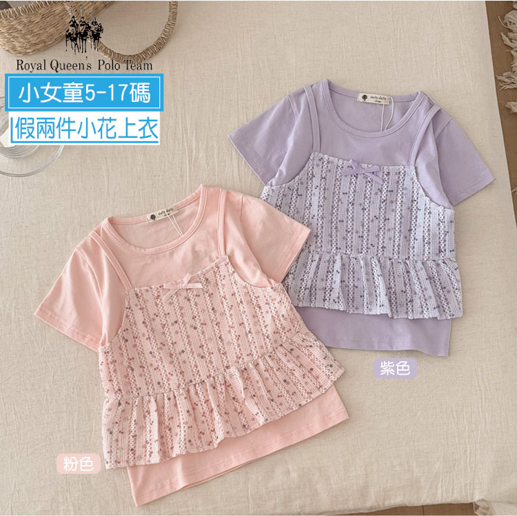 小女童 假兩件可愛小花網狀蕾絲短袖圓領T恤 5-17碼 [95385] RQ POLO 小童 春夏童裝 小清新優雅浪漫