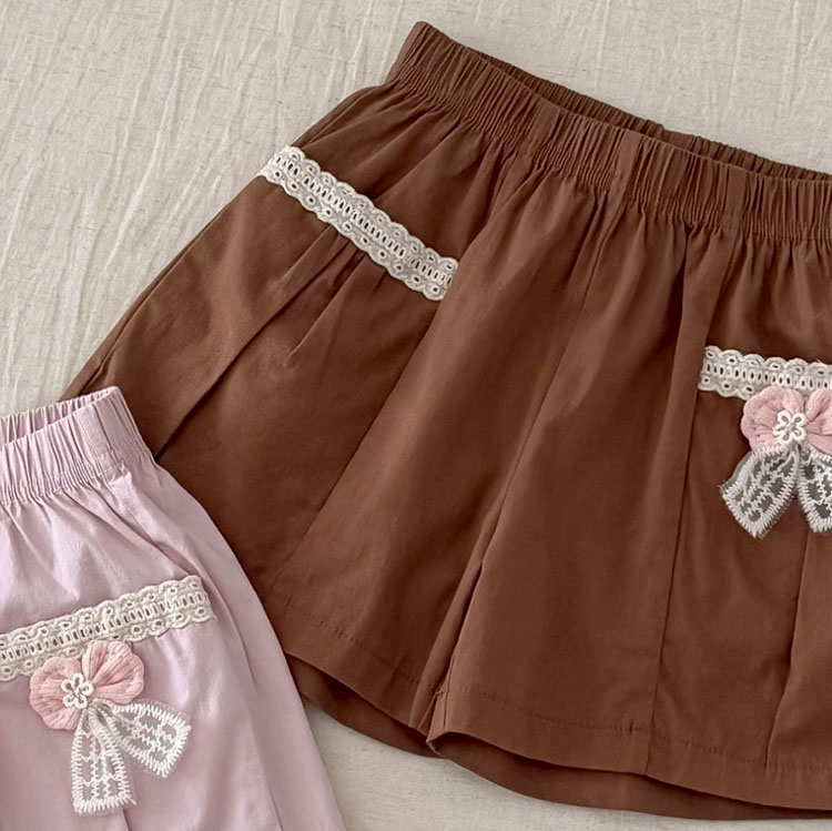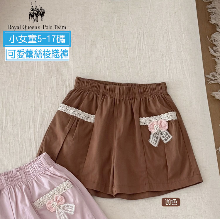 小女童 可愛蕾絲蝴蝶結鬆緊 梭織短褲【咖色】5-17碼 [95446] RQ POLO 春夏童裝 平織褲 休閒褲 雙口袋 褲裙