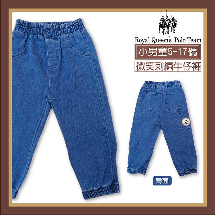 小男童 微笑刺繡牛仔長褲 藍色 [52390-1] RQ POLO 秋冬童裝 小童5-17碼 鬆緊牛仔褲 下縮口 百搭