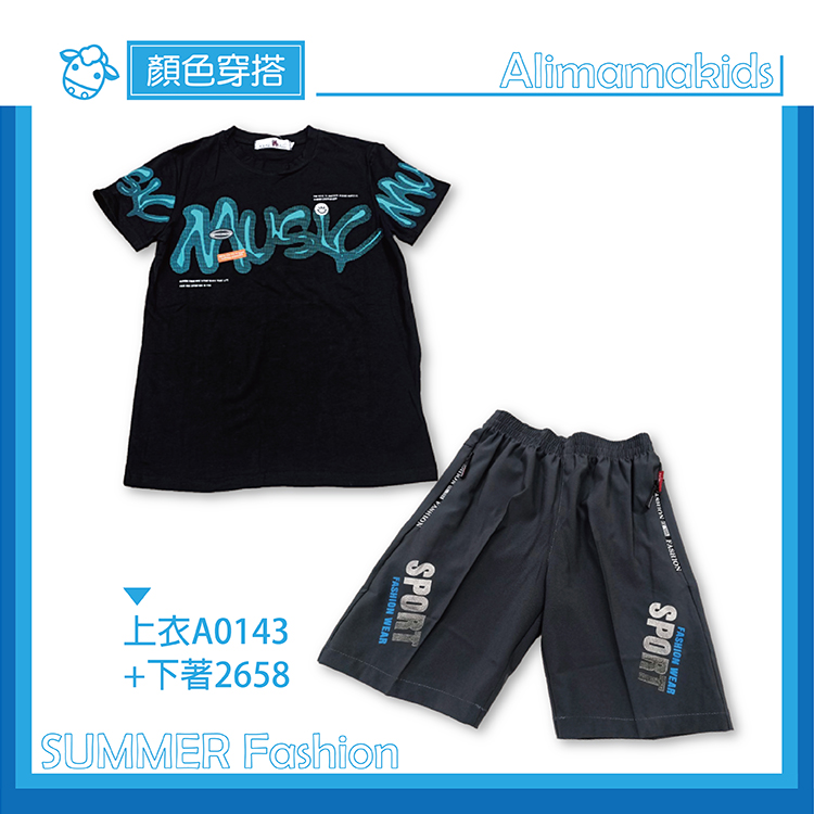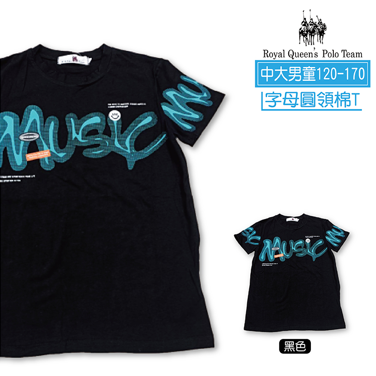 潮流圖案的短袖圓領T恤,胸前印刷MUSIC字母圖案,袖子上也有印刷點綴,