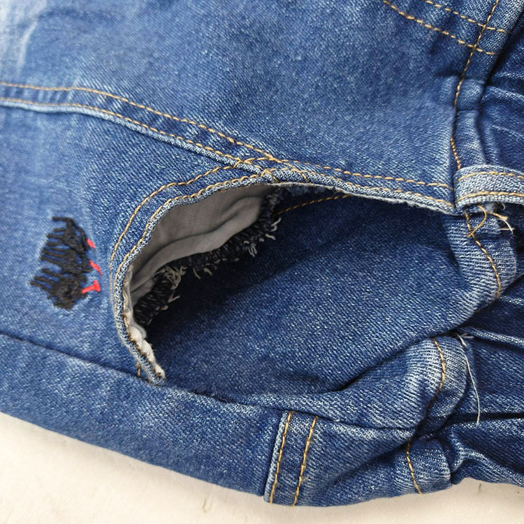 鬆緊褲頭的牛仔長褲,兩側各有一個口袋,下方褲腳縮口設計,