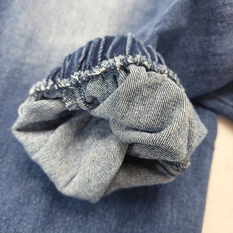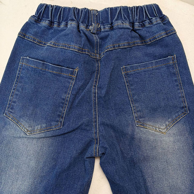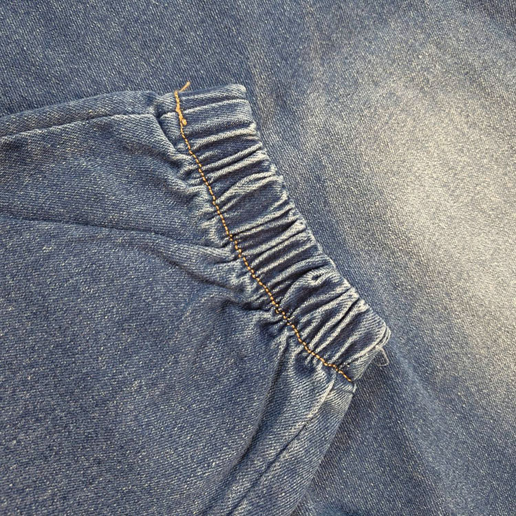 鬆緊褲頭的牛仔長褲,兩側各有一個口袋,下方褲腳縮口設計,
