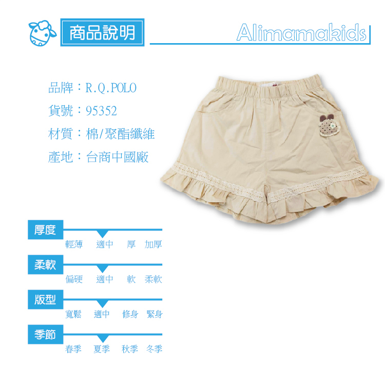 鬆緊褲頭,雙口袋,左邊口袋下方有一立體小兔耳朵圖案