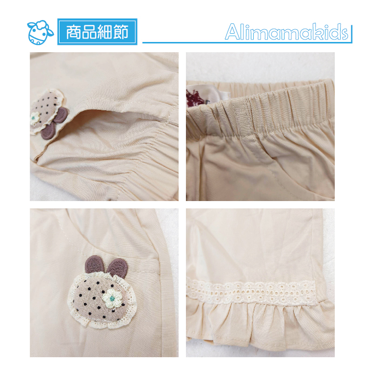 鬆緊褲頭,雙口袋,左邊口袋下方有一立體小兔耳朵圖案
