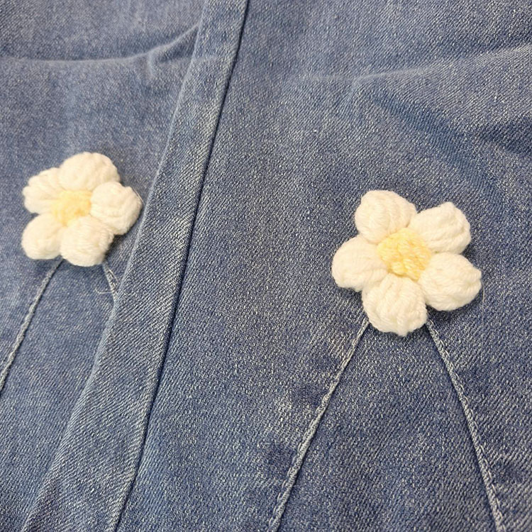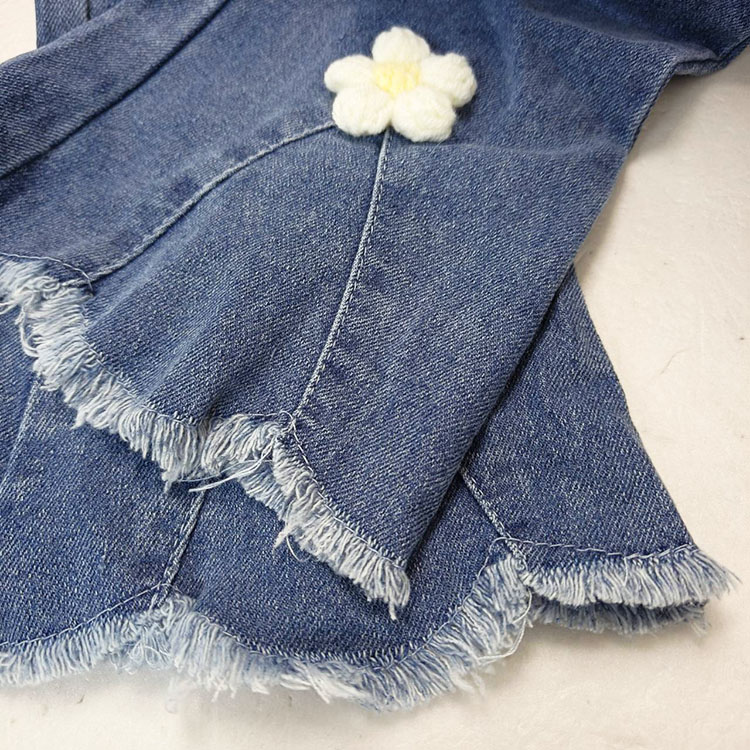 褲腳有鬚鬚設計~還有立體的毛線小花點綴~是款簡單又百搭的牛仔褲喔!