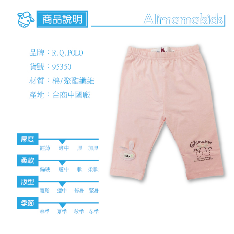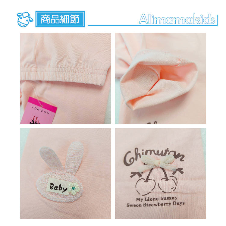 鬆緊褲頭,棉質材質~很舒服~右邊褲腳有立體兔兔圖案,左邊有印刷櫻桃字母~非常可愛喔!