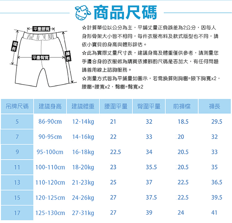 17碼(約三年級) 建議身高/體重125-135cm/27-31kg 腰圍27 臀圍39.5 前褲檔24.5 褲長41.5