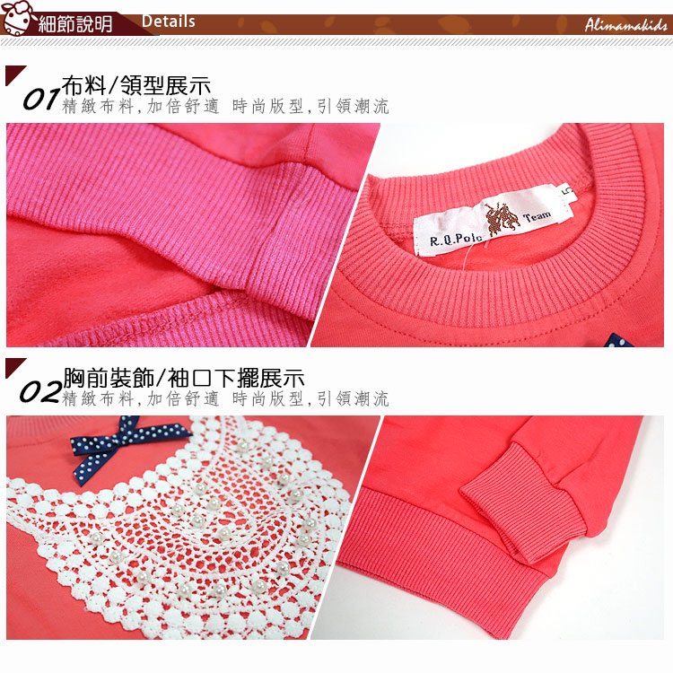 粉色圓領長袖上衣,胸前有珍珠蕾絲裝飾,領口.袖口及下擺拼接羅紋束口,簡單舒適活力女孩秋冬必備款。