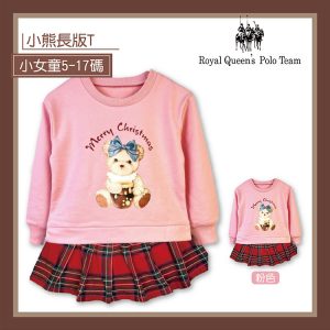 小女童 格紋小熊長袖長版T恤 粉色 [A1136] RQ POLO 小童 秋冬童裝 5-17碼 台灣現貨 聖誕節 學院風
