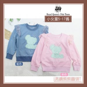 小女童 亮鑽小熊蕾絲袖 薄長袖T恤 寬版 [10658] RQ POLO 小童 秋冬童裝 5-17碼 台灣現貨