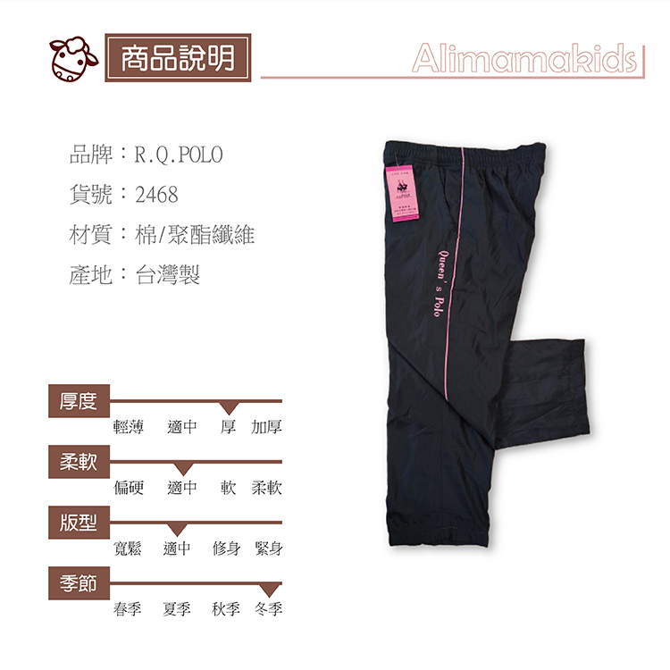 鬆緊褲頭的風褲 運動褲~內有鬆緊綁帶可以調整,適合秋冬穿著,側邊有電繡Queen’s Polo字樣點綴,